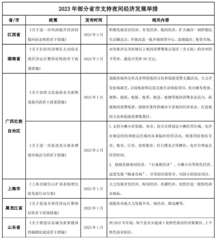 政策方面,山西省、新疆维吾尔自治区、辽宁省、重庆市等地在2023年政府工作报告中提及对“夜间经济”的支持举措。记者注意到近期相关政策密集发布,2月以来,广西、湖南、江西、浙江宁波等省市相继给出方案助力繁荣夜间经济活力。